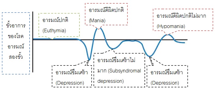 โรคอารมณ์สองขั้วโดยพื้นฐานแล้วจะมีลักษณะของอารมณ์ที่ขึ้นลง (Swing) เดี๋ยวเศร้า เดี๋ยวอารมณ์ดี ซึ่งจากภาพที่ 1 เป็นการแสดงอาการขั้วอารมณ์ที่แสดงออกของผู้ที่มีอาการอารมณ์สองขั้วได้แก่