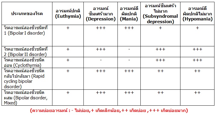 ตารางที่ 1 แสดงอาการของผู้ที่มีโรคอารมณ์สองขั้วประเภท/ชนิดต่างๆซึ่งแยกความผิด ปกติกันที่ขั้วอารมณ์