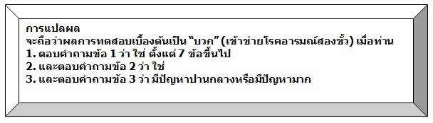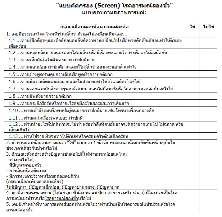 *อนึ่ง: เมื่อเริ่มสงสัยว่าจะมีอาการของโรคอารมณ์สองขั้วให้ใช้แบบคัดกรองช่วยดังนี้