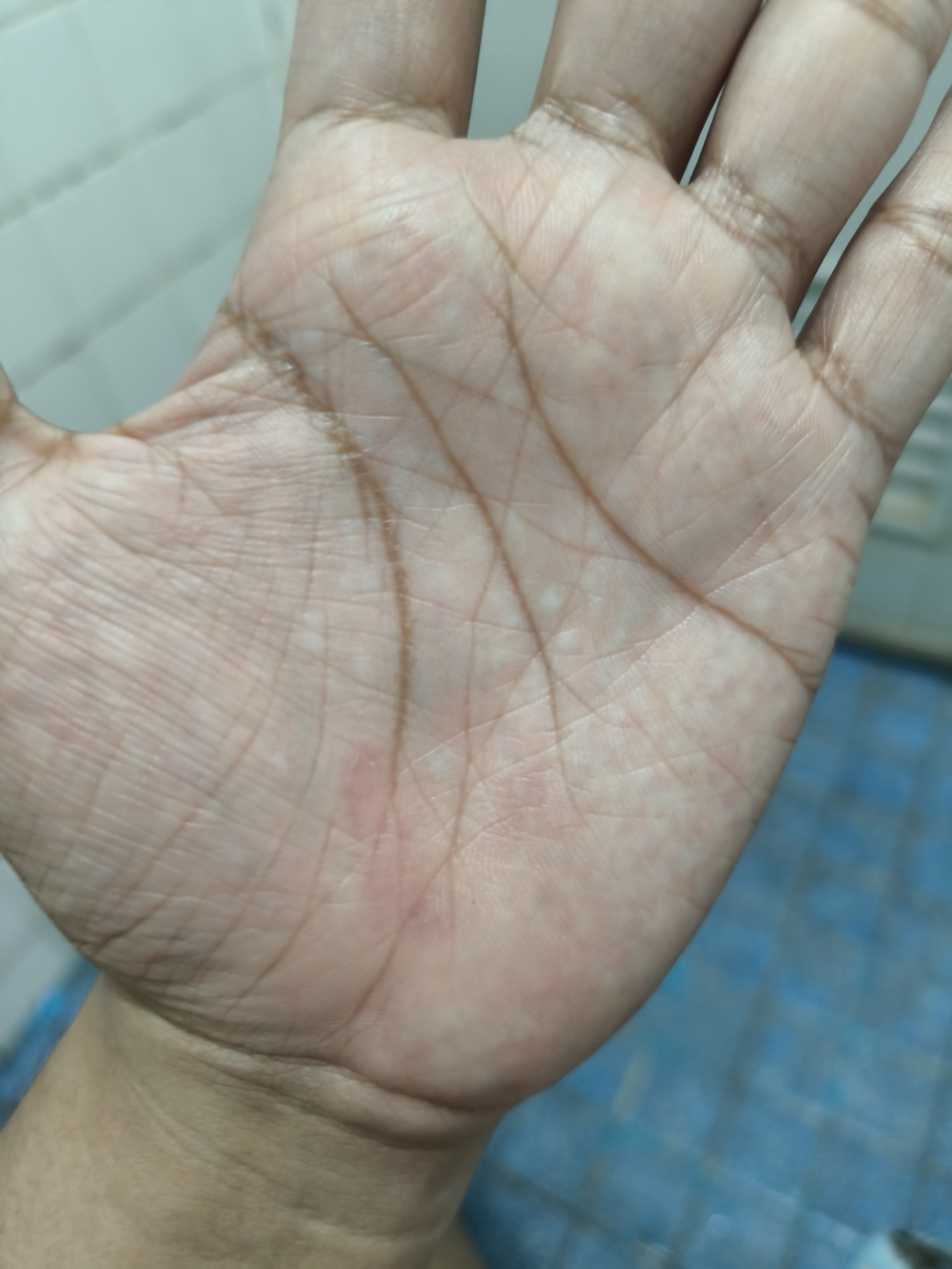 1 มิถุนายน 2568 23:00:44 #2 ดูจากรูป เห็นเป็นผื่นที่ฝ่ามือทั้งสองข้ 1.แผลริมแข็งหรือระยะที่ 1 รักษาโดยฉีดยา benzathine 2.4 ล้านยูนิต ครั้งเดียว 2. ระยะที่ 2 มีอาการต่อมน้ำเหลืองโต ผื่นขึ้นตามตัวไม่คัน ผมร่วงเป็นต้น รักษาโดยฉีดยา benzathine 2.4 ล้านยูนิต ครั้งเดียว 3.ระยะแฝง ไม่มีอาการ รักษาโดยฉีดยา benzathine 2.4 ล้านยูนิต 3 ครั้งติดต่อกัน (อาทิตย์ละ 1 เข็ม) แต่ถ้าไม่มีความเสี่ยง เช่นใช้ถุงยางทุกครั้ง ก็อาจเป็นโรคผิวหนัง เช่น แพ้หรือระคายต่อสารที่สัมผัสเป็ |