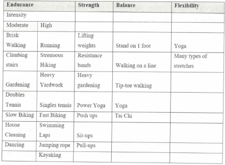 ตารางต่อไปนี้ แสดงถึง 4 เสาหลักของความสมบูรณ์ของร่างกาย อันได้แก่ ความทรหด (Endurance), ความแข็งแกร่ง (Strength), การทรงตัว (Balance), และความยืดหยุ่น (Flexibility) พร้อมด้วยความเข้มข้น (Intensity) ของระดับปานกลาง (Moderate) ถึง สูง (High)