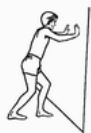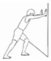 การยืดกล้ามเนื้อน่อง : ยืนตรง มือทั้งสองข้างจับกําแพง ก้าวขาซ้ายไปด้านหน้า ค่อยๆย่อเข่าซ้ายพร้อมกับย่อเข่าข้างขวา โดยเท้าขวาสัมผัสพื้น จนรู้สึกตึงบริเวณน่องข้างขวา แล้วทําสลับข้าง