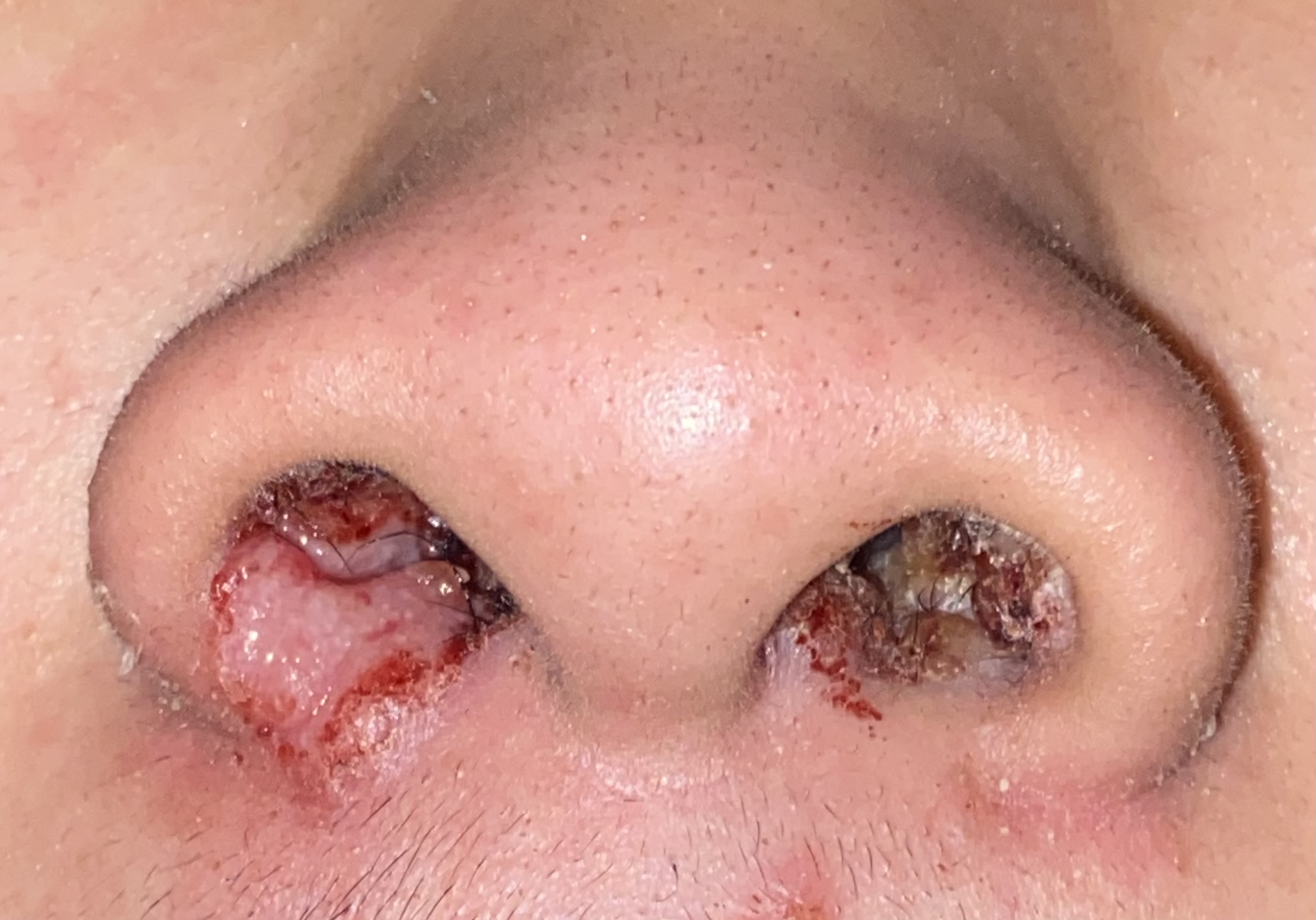 เป็นแผลเหมือนสะเก็ดเลือด ทั้งสองข้าง รอบๆรูจมูก มีเนื้อนูนๆขึ้นมา  จนขอบๆรูจมูกเริ่มเป็นเนื้อนูนๆขึ้นมาบางทีเป็นสะเก็ด พอแกะแล้วเลือดไหล แผลเนื้อมีจุดขาวๆเล็กๆ