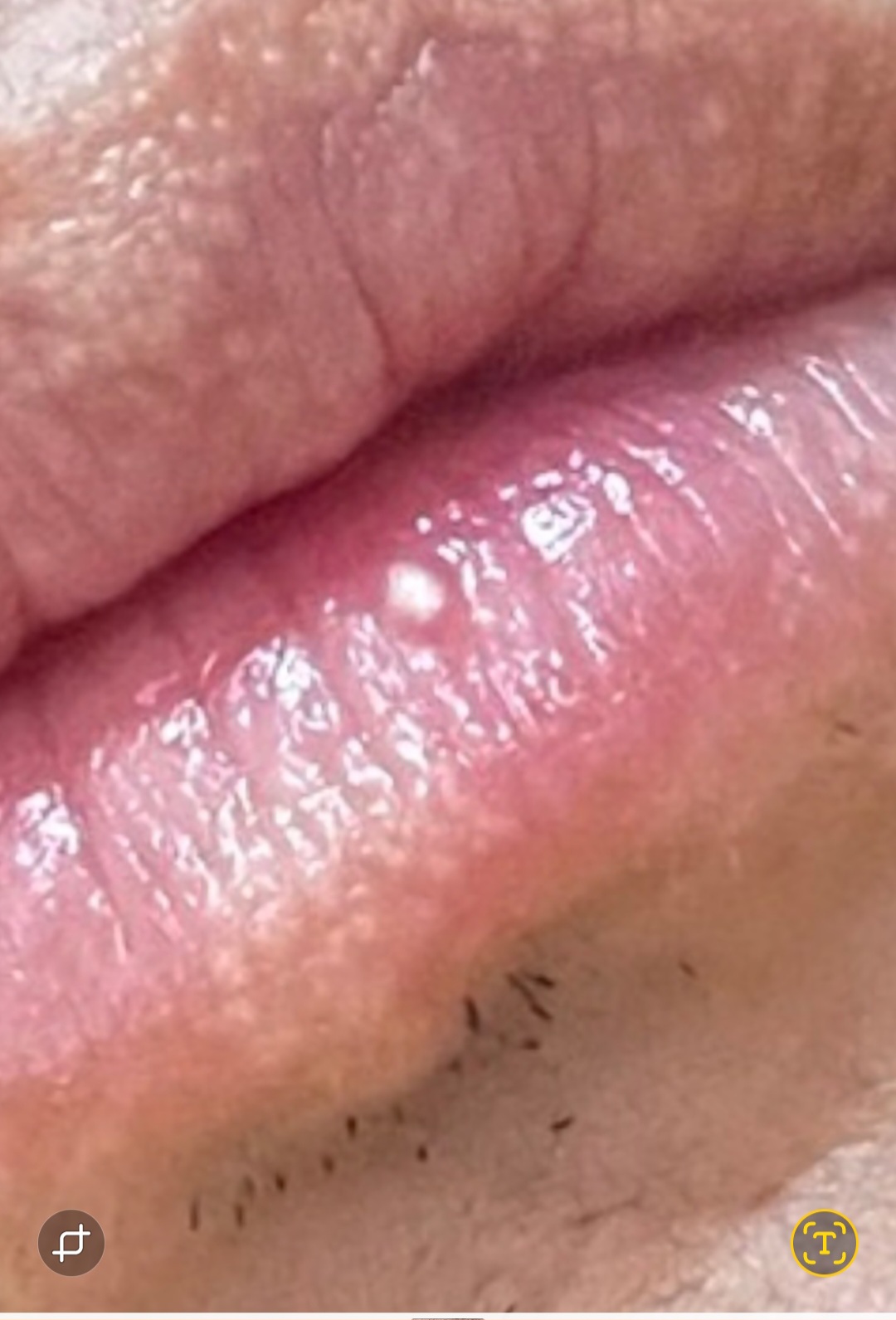 1 เมษายน 2568 11:11:20 #2 ดูจากรูปที่ส่งมา เห็นเป็นตุ่มเล็กๆที่ริมฝีปาก ลักษณะคล้ายเป็นตุ่มหนองหรือมี |