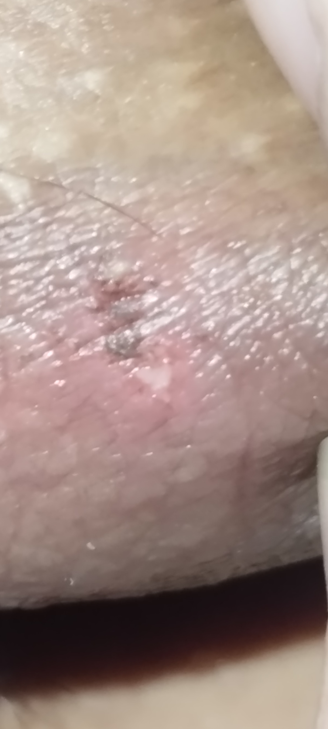 | มีแผลตกสะเก็ดบริเวณองคชาต และแผลที่ถุงอันฑะ | |