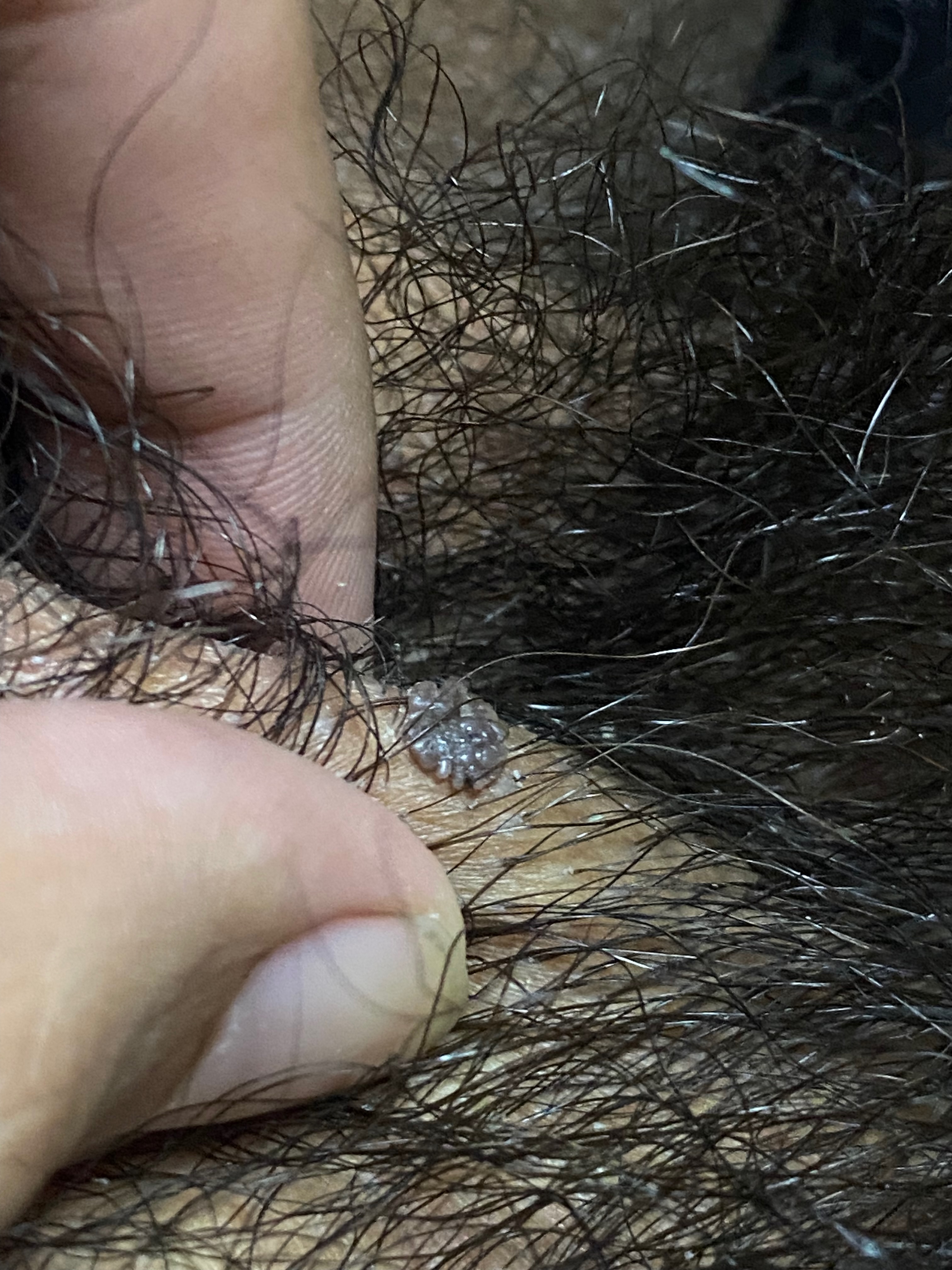 4. ถ้าเคยมีความเสี่ยงทางเพศสัมพันธ์ เช่น มีคู่นอนหลายคน ไม่ใช้ถุงยาง อาจจะเป็นหูดข้าวสุก เกิดจากเชื้อไวรัส Molluscum contagiosum เป็นตุ่มมีรอยบุ๋มตรงกลาง บีบดูจะมีสารสีขาวขุ่นคล้ายข้าวสุก รักษาโดยการบีบเอาสารตรงกลางตุ่มออก แล้วทายาฆ่าเชื้อหรืออาจเป็นเริ