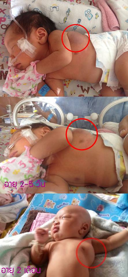 ซึ่งสามารถวินิจฉัยแยกโรคเบื้องต้นได้จากการทำอัลตร้าซาวนด์ (Doppler Ultrasound) เนื่องจากไม่ได้ตรวจร่างกายลักษณะของก้อน ความนุ่มความแข็งของก้อนเอง แต่เท่าที่ดูจากภาพคิดว่ามีโอกาสเป็นเนื้อร้ายหรือมะเร็งน้อยมากค่ะ แต่เป็นโรคที่ควรต้องได้รับการตรวจเพิ่มเติม เนื่องจากส่วนใหญ่ไม่สามารถหายเองได้ ยกเว้นเป็นก้อนของหลอดเลือดแดงโต (Hemangioma) ซึ่งอาจจะหายเองได้ภายใน 2-5 ปี โดยการรักษาขึ้นกับสาเหตุและชนิดของก้อนว่าเป็นถุงน้ำหรือไม่ และเป็นถุงน้ำขนาดใหญ่หรือเล็ก ซึ่งจะวางแผนรักษาได้ดียิ่งขึ้นเมื่อทราบผลอัลตร้าซาวน์แล้วค่ะ ไม่มีข้อห้ามใดๆ ไม่มีการจำกัดอาหาร สามารถรับประทานได้ตามปกติ ตามที่ปรึกษามา คิดว่าแพทย์ท่านที่ดูตอนแรกเกิด น่าจะคาดว่าเป็นก้อนของหลอดเลือดแดงโต (Hemangioma) ซึ่งอาจหายเองได้ จึงแนะนำให้ดูอาการก่อนหากไม่หายเองจึงจะส่งตรวจเพิ่มเติม ในข้อมูลที่ให้มาไม่ทราบว่าได้ตรวจเพิ่มเติมอะไรไปแล้วบ้าง แต่หากยังไม่เคยตรวจอัลตร้าซาวน์ที่ก้อนแนะนำว่าควรตรวจเพิ่มเติมเพื่อการวินิจฉัยที่แม่นยำมากขึ้นค่ะ จึงขอแนะนำว่า น่าจะตรวจเพิ่มเติมเบื้องต้นด้วยการทำอัลตร้าซาวน์ (Doppler ultrasound) โดยสามารถปรึกษากุมารแพทย์หรือกุมารศัลยแพทย์ที่ รพ.ใกล้บ้าน เนื่องจากอาจเป็นก้อนที่หายเองได้ คือ ก้อนของหลอดเลือดแดงโต (Hemangioma) หรือเป็นก้อนที่ไม่หายเองตามข้อ 1,3,4 ซึ่งต้องวางแผนการรักษาเพิ่มเติมกับทีมแพทย์ และถ้าเป็นก้อนเนื้องอก จะได้วางแผนรักษาโดยไม่ล่าช้าค่ะ |
